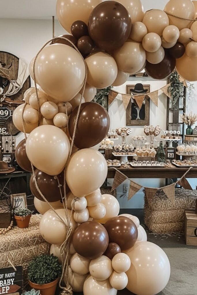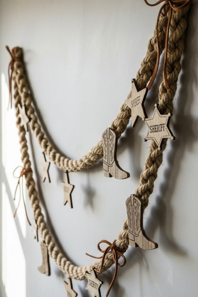 Rope garlands add texture and reinforce the cowboy theme while staying minimal and easy to set up.