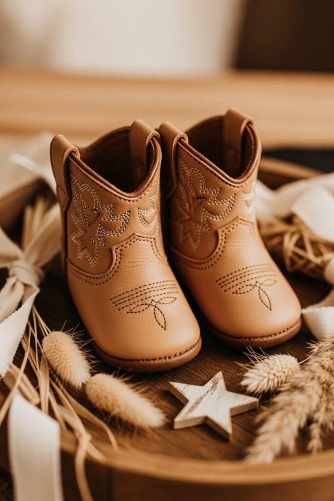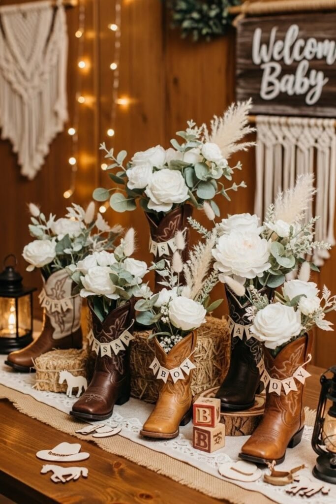 Display tiny cowboy-style baby booties on a rustic tray or small shelf as a decor accent. This adds a sweet baby-focused touch while staying true to the theme.