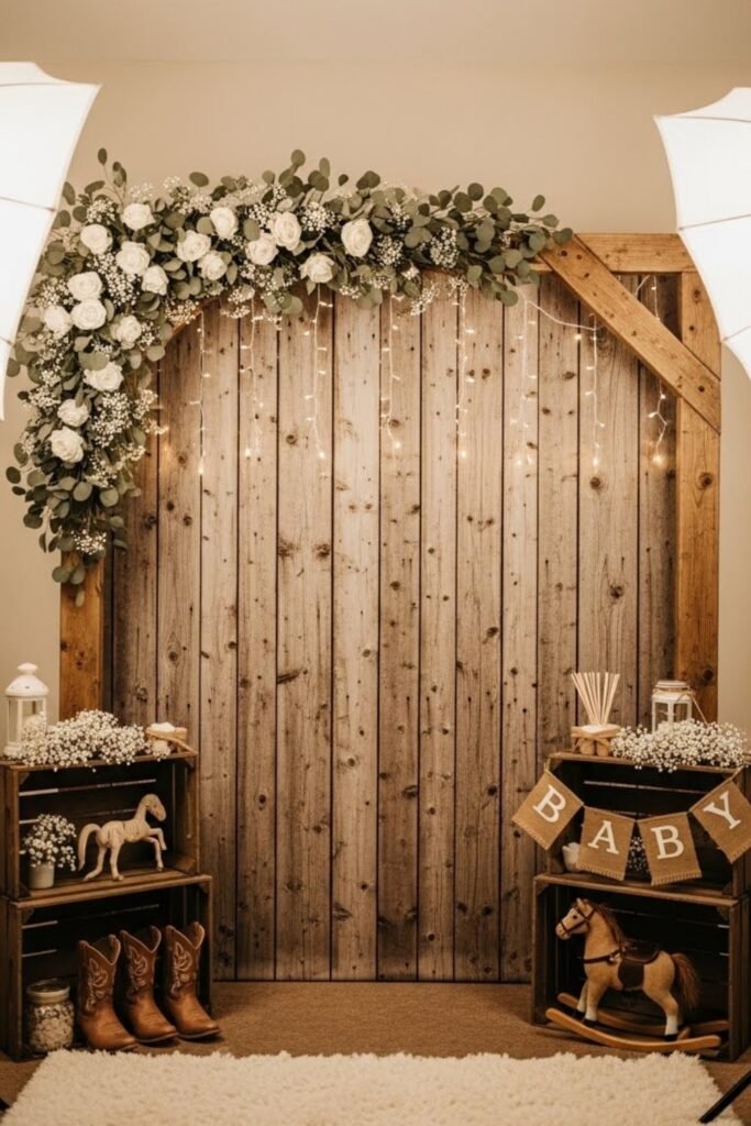 This works well behind the gift table or as a subtle photo backdrop, adding texture and a true cowboy ranch vibe without using common baby shower props.