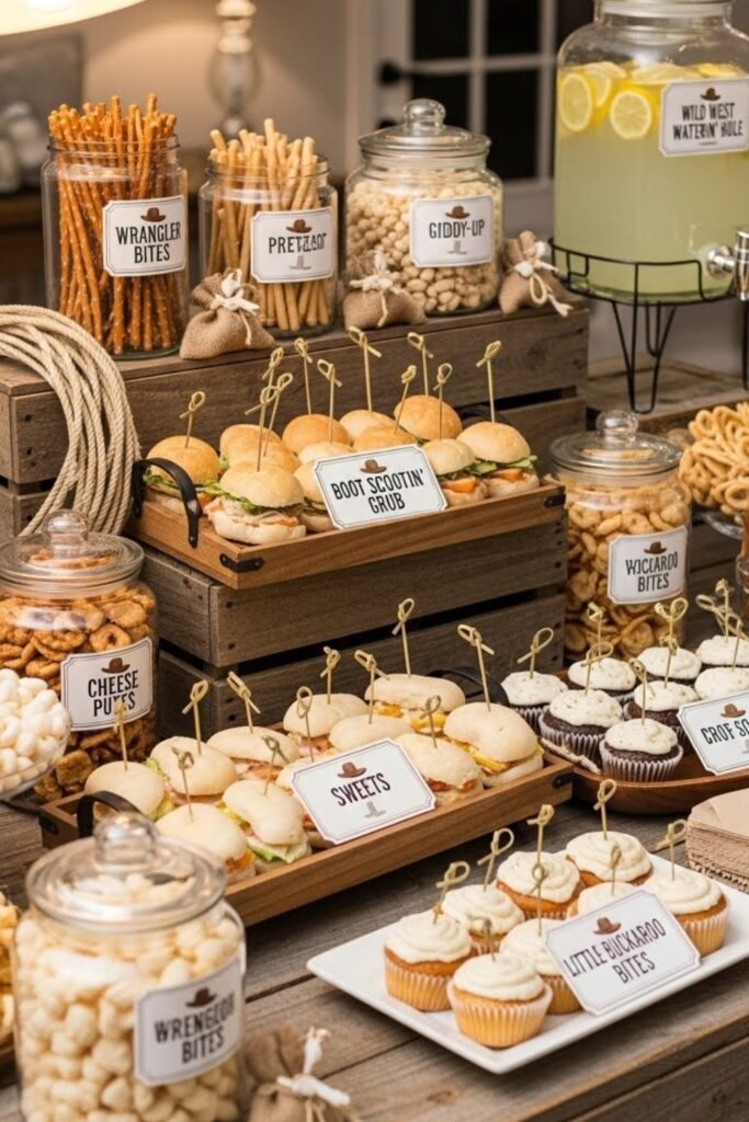 Use western-style labels for snacks like popcorn, cookies, or trail mix. Simple fonts with small cowboy icons keep the look clean and themed.