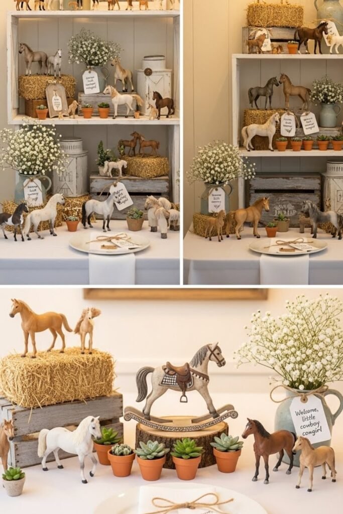 Place small toy horses on shelves, tables, or the dessert area as subtle western accents. Choose neutral or wooden styles so they don’t feel too childish.