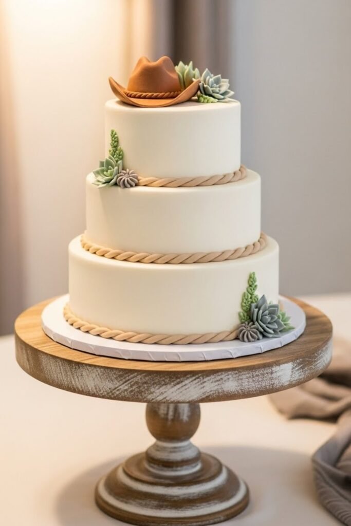 Display the cake on a rustic wooden cake stand instead of a traditional glass one. This small switch instantly adds a western feel without extra decoration.