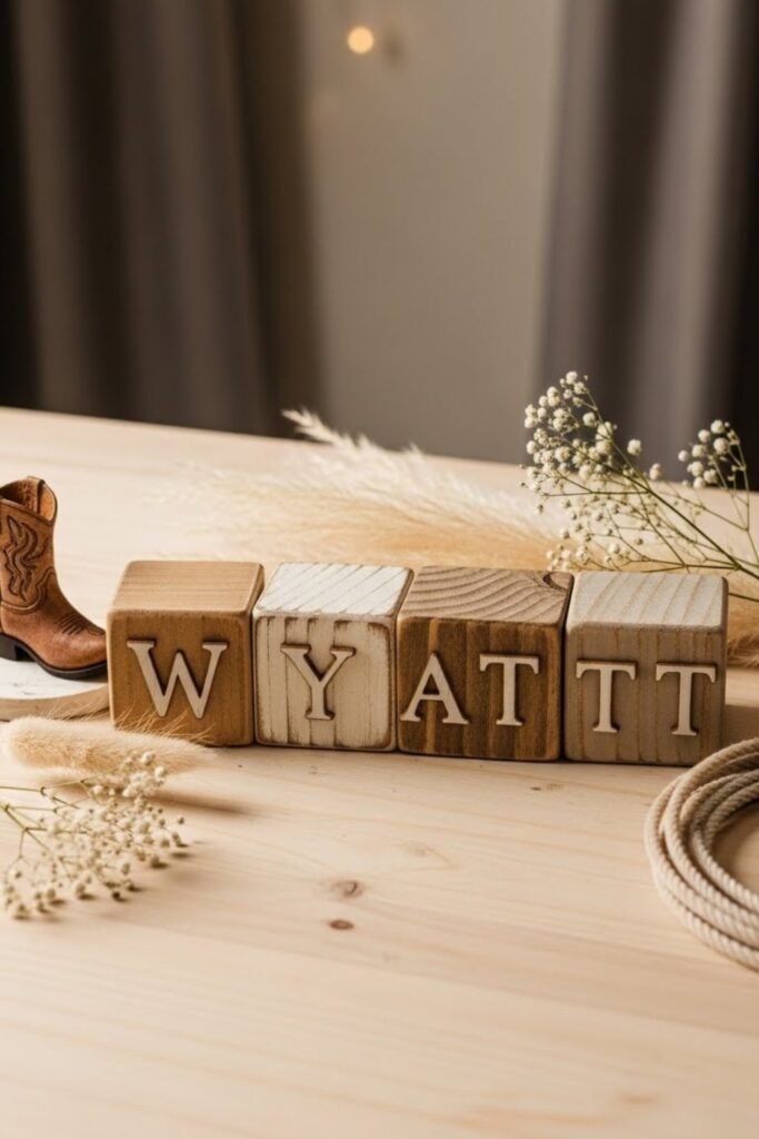 Decorate wooden letter blocks spelling the baby’s name and place them on a shelf or table. Choose natural wood tones or soft neutral paint to keep the look cohesive.
