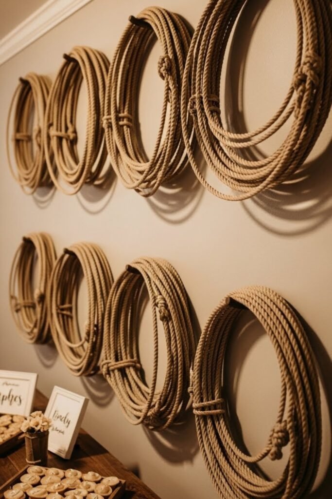 Create a western accent wall using neatly hung cowboy lassos arranged in a simple pattern. Keep the ropes clean and light-toned so the look feels decorative, not heavy.
