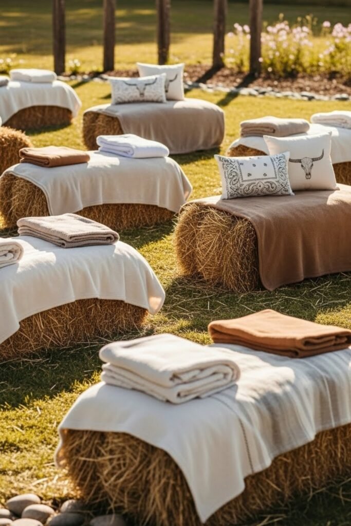 Create casual seating using clean hay bales covered with neutral throws or soft blankets. This works especially well for outdoor baby showers or backyard setups.