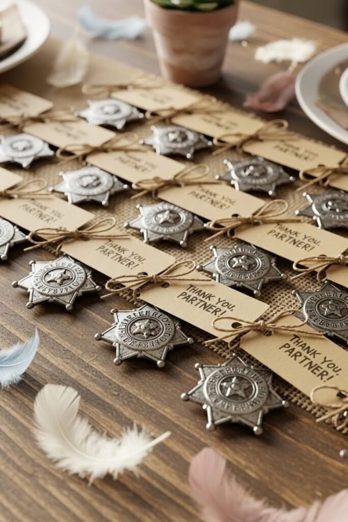 Hand out mini sheriff badge favors as a fun cowboy-themed takeaway. These can be attached to favor bags or placed on each guest’s plate.
