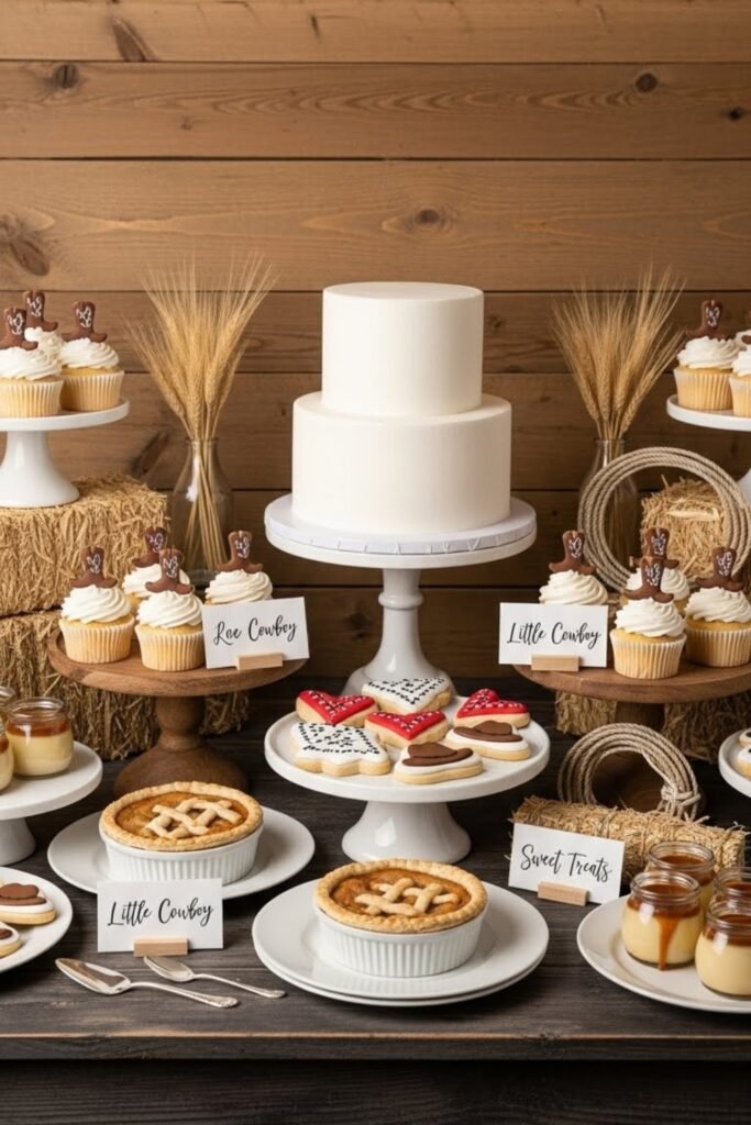 Style the dessert table using a wooden backdrop or reclaimed wood panels for a rustic western look. Pair it with simple white stands so the sweets stand out without clashing.