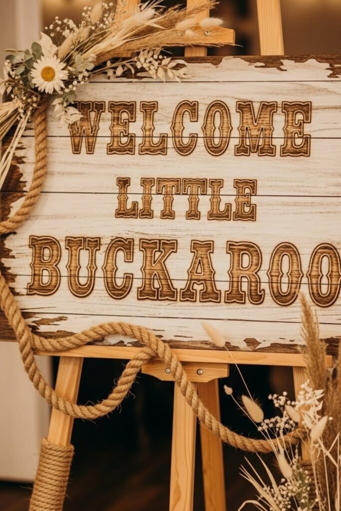 Place a wooden “Welcome Little Buckaroo” sign at the entrance to instantly introduce the cowboy theme. Use rope trim, western fonts, or soft neutral paint to keep it baby-friendly.