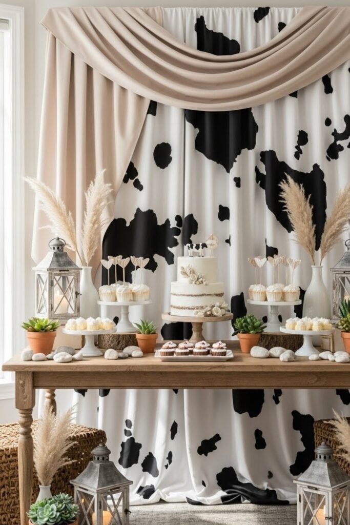Create a soft cow-print backdrop using fabric, paper panels, or a printed banner. Keep the colors light so it feels baby-friendly rather than bold.