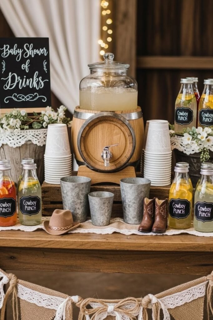 Serve drinks from a small faux barrel or barrel-style container to add a western ranch touch. Place it on a sturdy table with simple labels for water, juice, or lemonade.