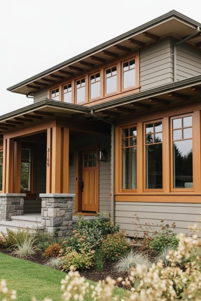 Handcrafted wood trim enhances doors, windows, and roof edges in Craftsman homes. Thicker trim profiles create strong outlines and emphasize quality workmanship.
