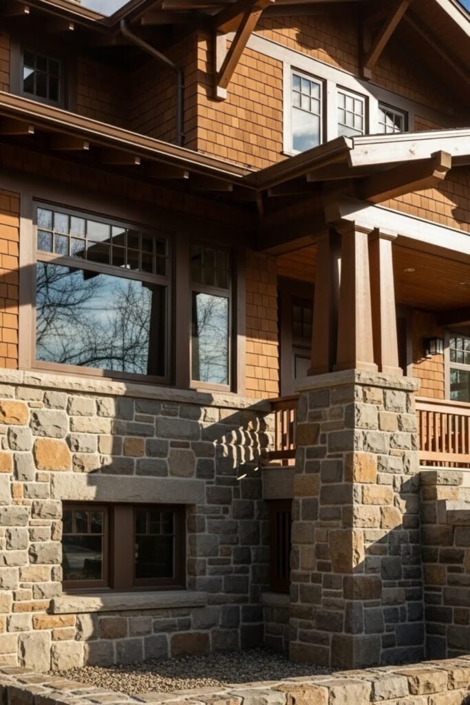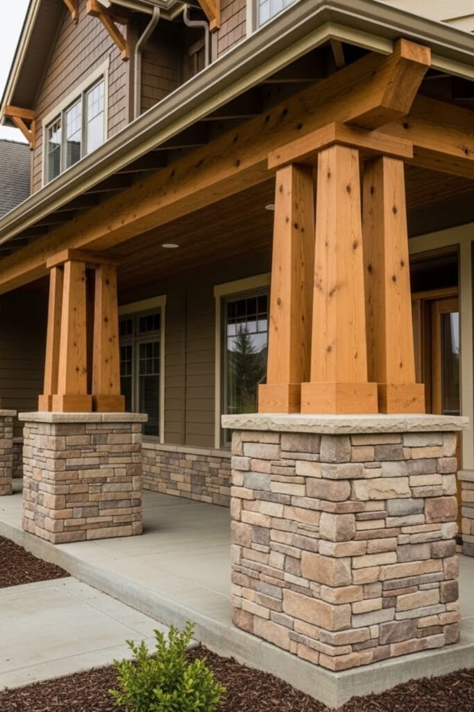 Stone porch columns give Craftsman homes a grounded, solid presence. Using stacked stone or river rock at the base adds texture and weight to the front elevation.