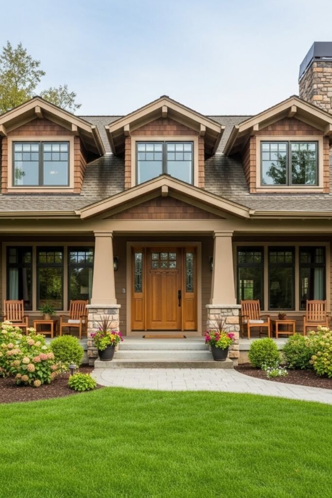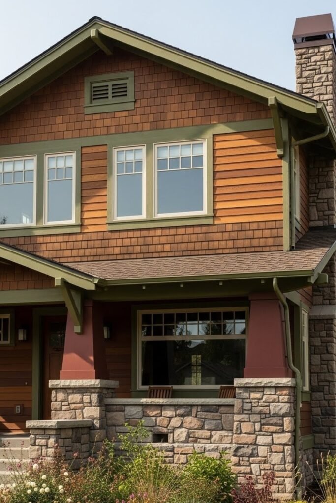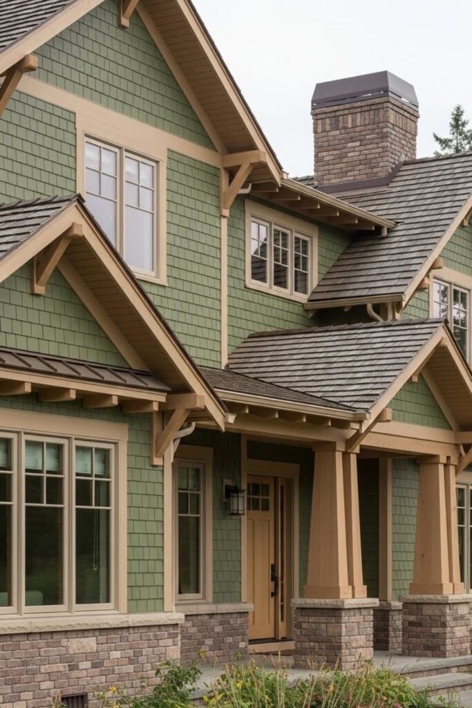 An earthy color palette defines the Craftsman style. Shades like moss green, warm taupe, rust, and soft beige keep the exterior natural and calming.