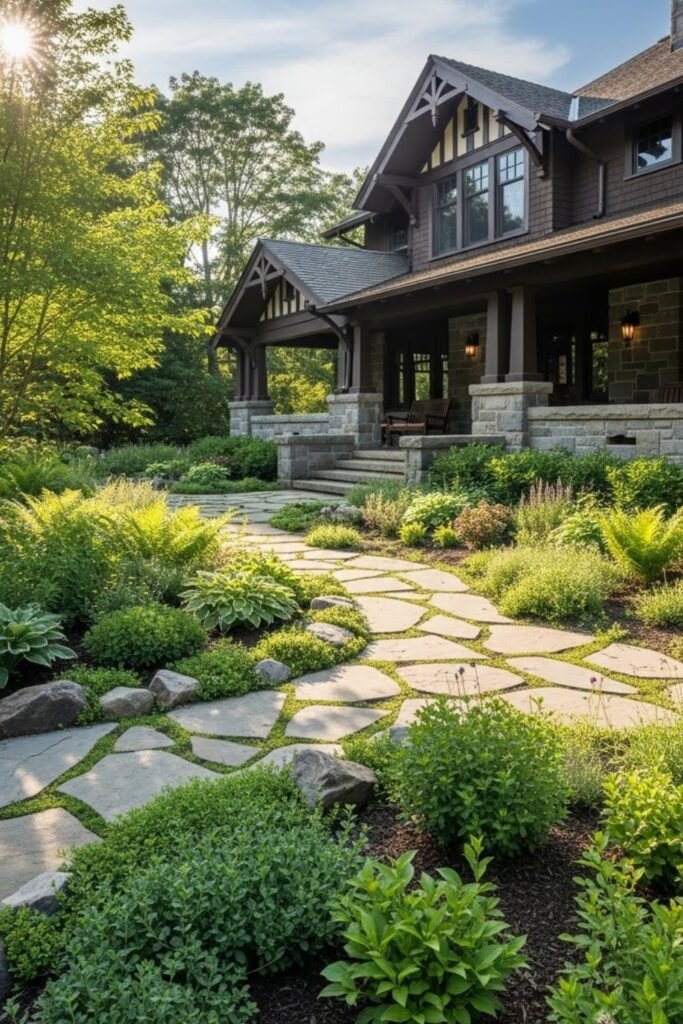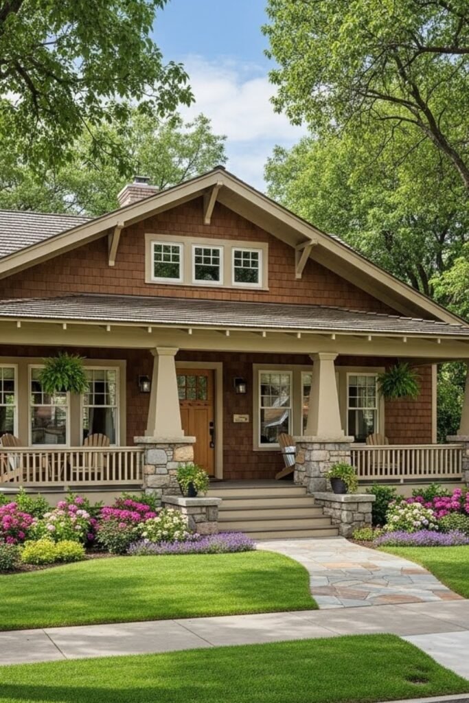 Blending the home with its surroundings is a key Craftsman principle. Native plants, stone paths, and low-maintenance greenery soften the exterior and enhance curb appeal.