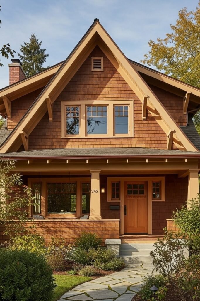 Earth-tone siding helps Craftsman homes blend naturally into their surroundings. Colors like olive, warm brown, clay, or muted gray emphasize the style’s connection to nature.