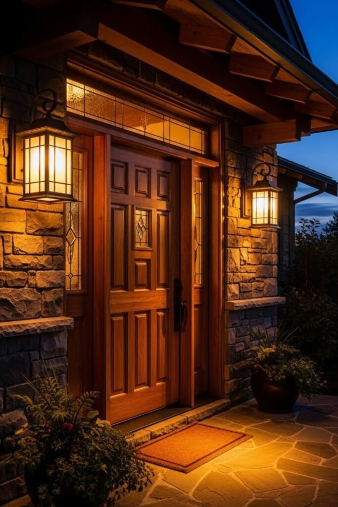 Entry lighting in Craftsman homes focuses on warmth and function. Lantern-style or bronze fixtures highlight the front door without glare.