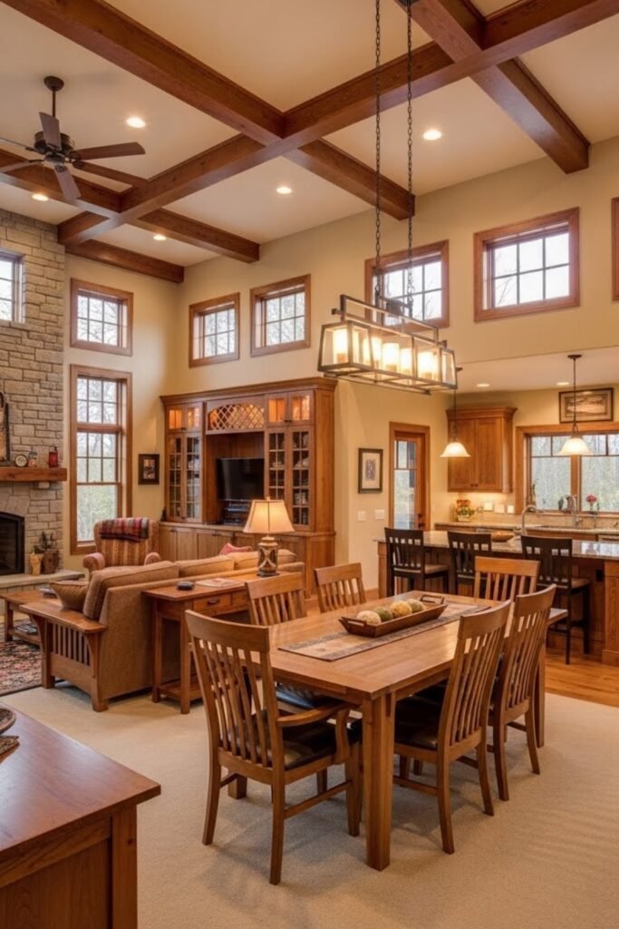 An open living floor plan complements the Craftsman focus on comfort and connection. Combining living, dining, and kitchen areas improves flow while keeping the home functional.
