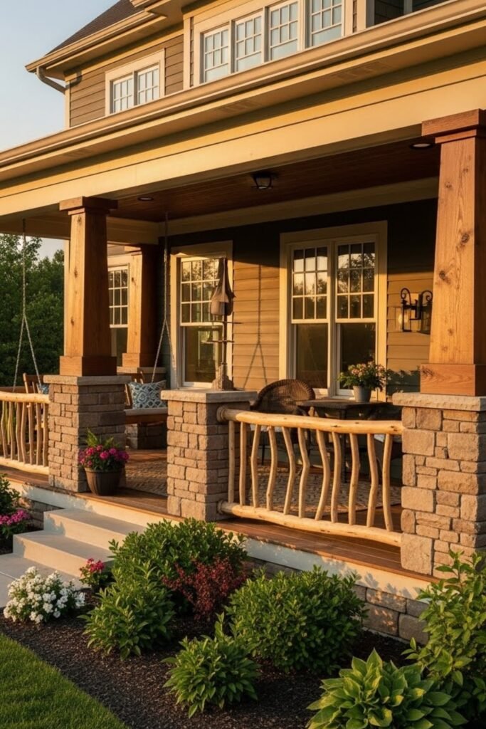 This idea works especially well for homes with wide porches, making the entry feel permanent, welcoming, and deeply connected to natural materials.