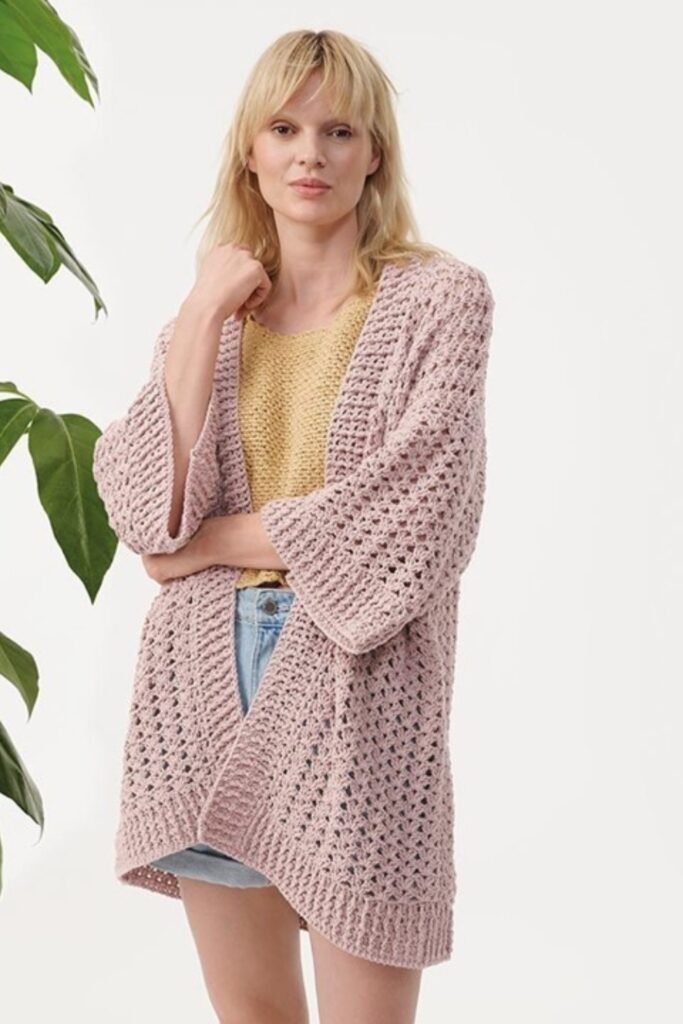 If you have a big crochet blanket or a sweater with loose stitches, you may make it into a light cardigan by cutting a clean opening in the front and completing the edges with a simple stitch or bias trim.