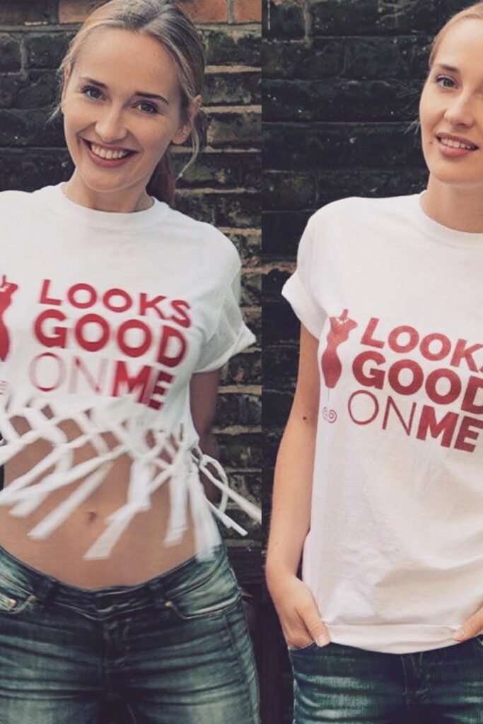 It’s great for giving fitted long-sleeves that are too simple a new look. To make it again, cut the hemline slightly above the waist and fold the sleeves in half twice to give them shape.