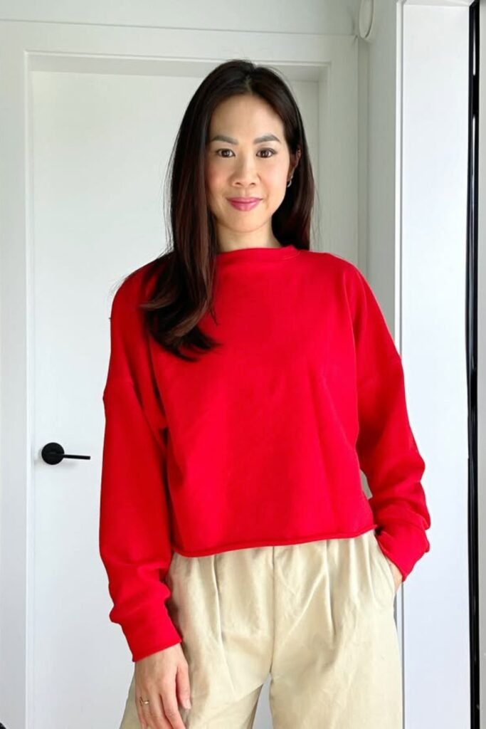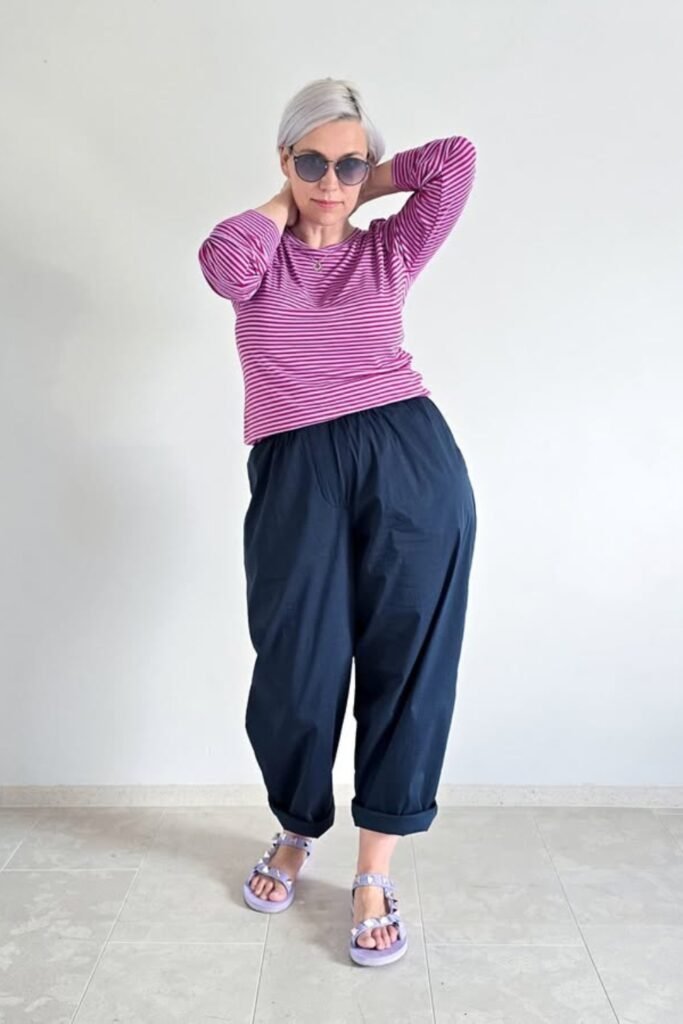 Works best with ribbed or stretch cotton fabrics that keep their shape. Wear it with loose pants for a casual-chic look that looks put-together but comfortable.