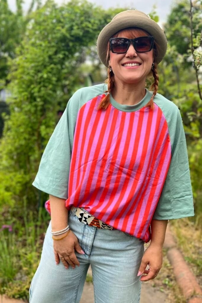 To make this look, cut the front off of an old striped tee and sew or glue it on an enormous shirt that is a different color.