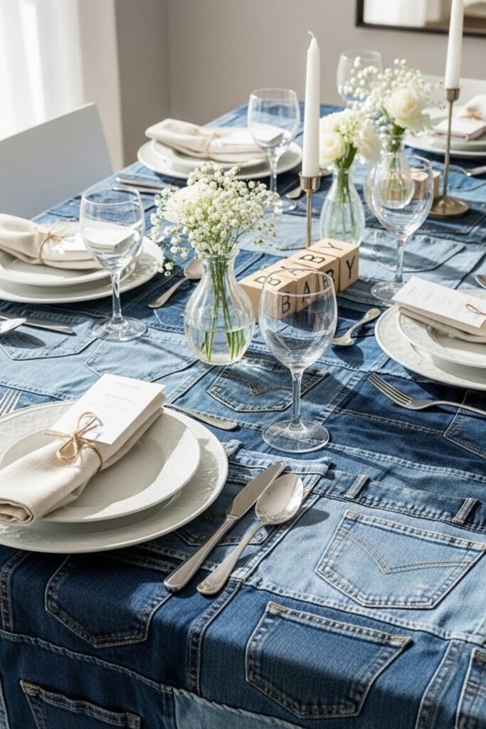 Cover a main table using stitched denim panels or laid-flat jeans for a casual statement look. This works best on gift or dessert tables where guests can notice details like seams and fades.