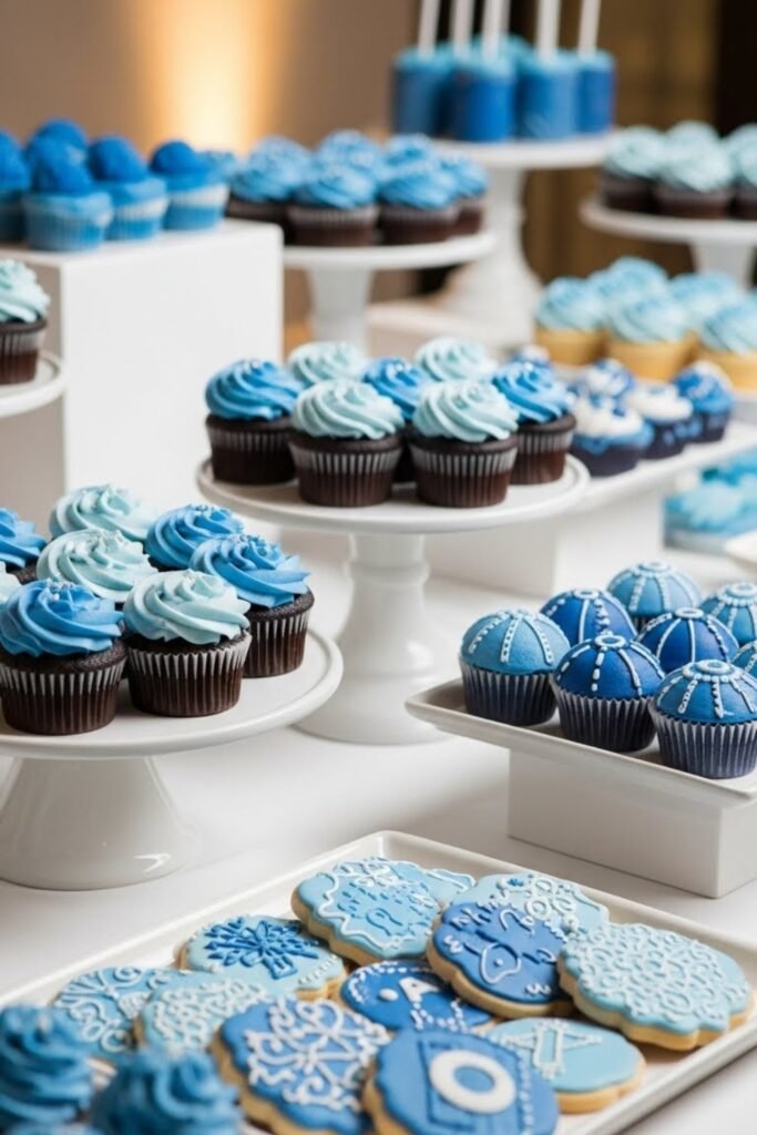 Design a dessert spread using layered blue shades inspired by denim washes. Think cupcakes, macarons, or cookies in light to dark blues.