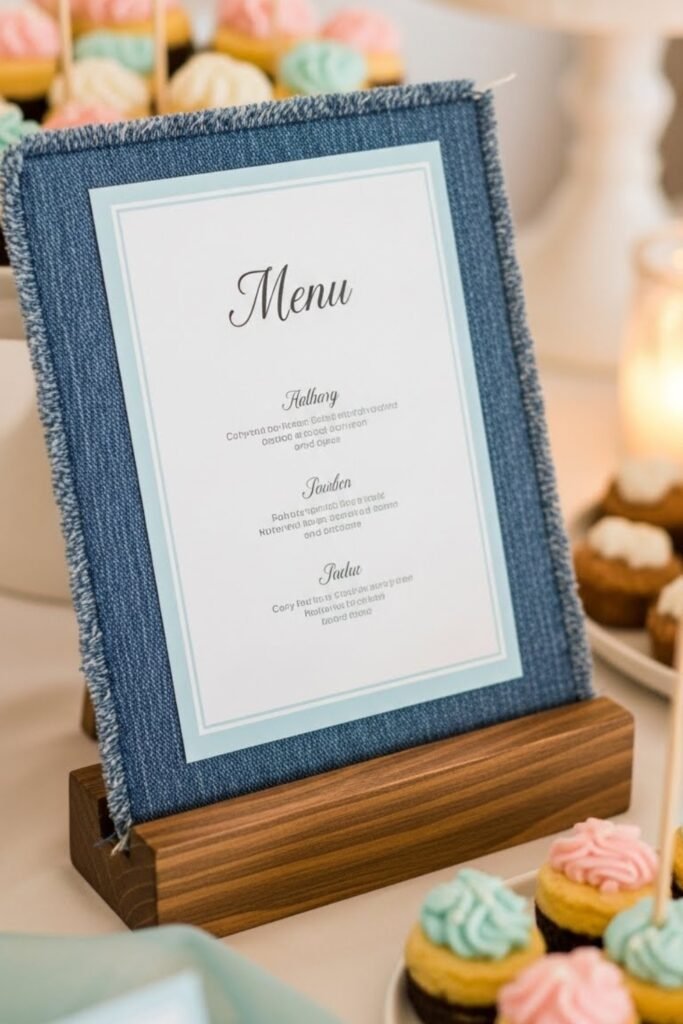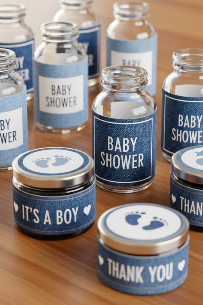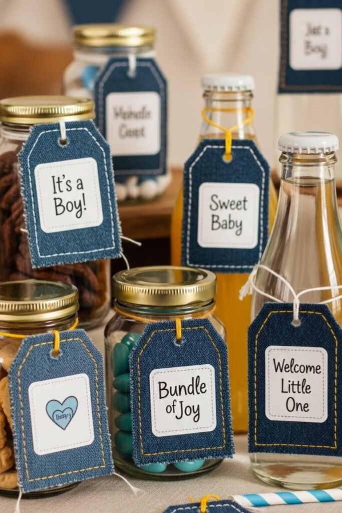 Add denim-style labels to bottles, jars, or favor containers to subtly reinforce the theme. Use fabric-textured paper or real denim accents for a tactile touch.