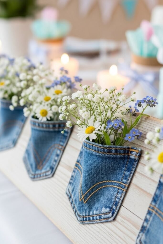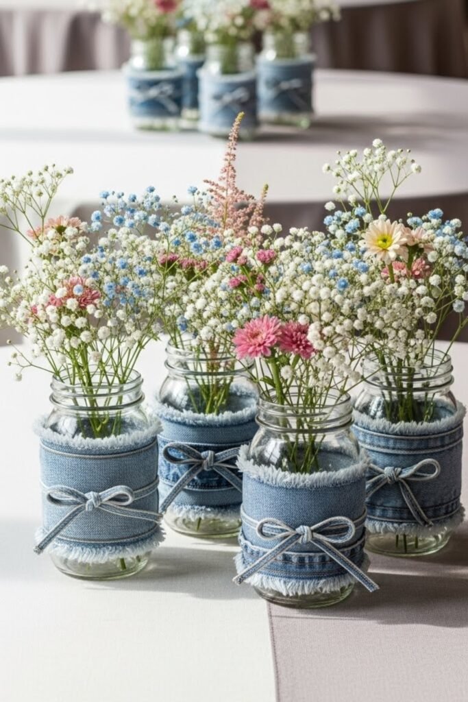 This adds texture without adding bulk and works well for guest tables. Keep the flowers light and simple so the denim detail remains the main visual feature.