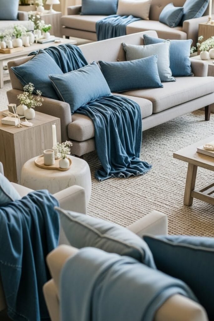 Keep the area soft and cozy with neutral rugs or light wood furniture so the denim feels inviting rather than heavy.