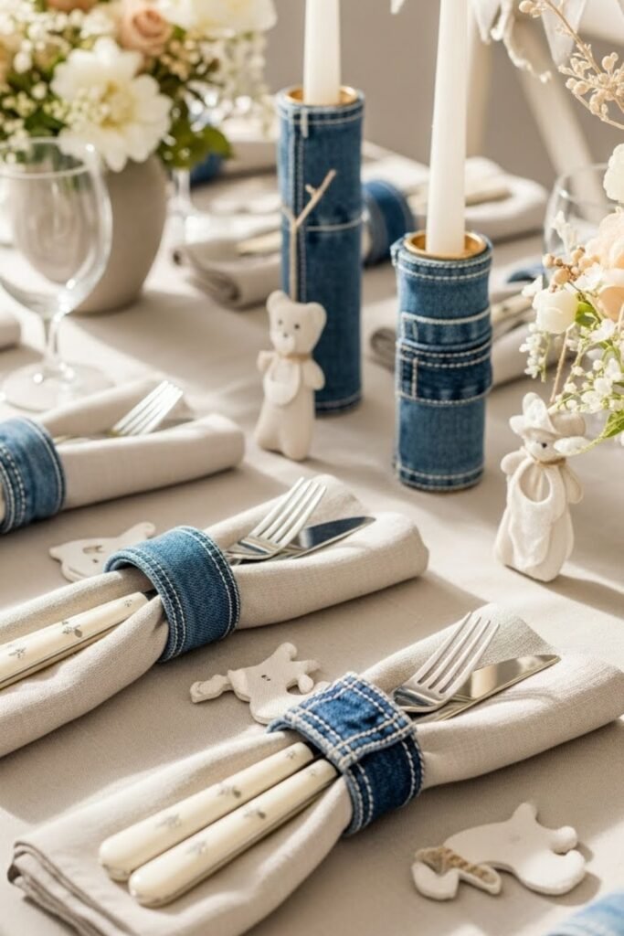 Finish the setup with small denim touches like napkin rings, tied utensils, or wrapped candles. These accents fill in visual gaps without adding clutter.