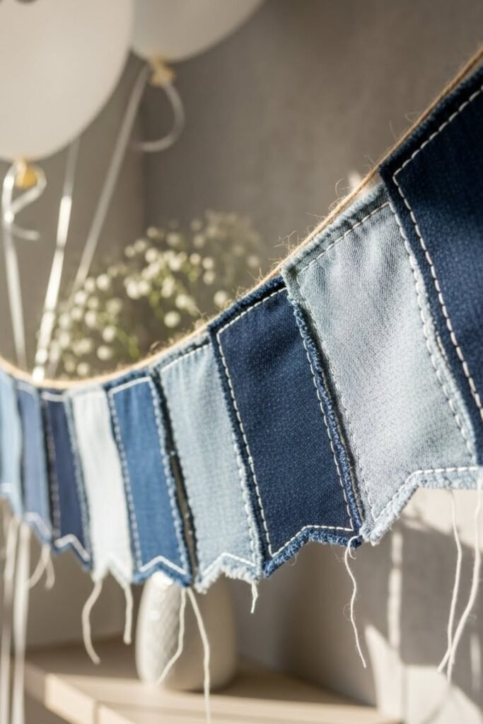 Create a banner using small denim fabric pieces cut into uniform shapes and strung with twine. Instead of letters, let the texture and color variations do the work.