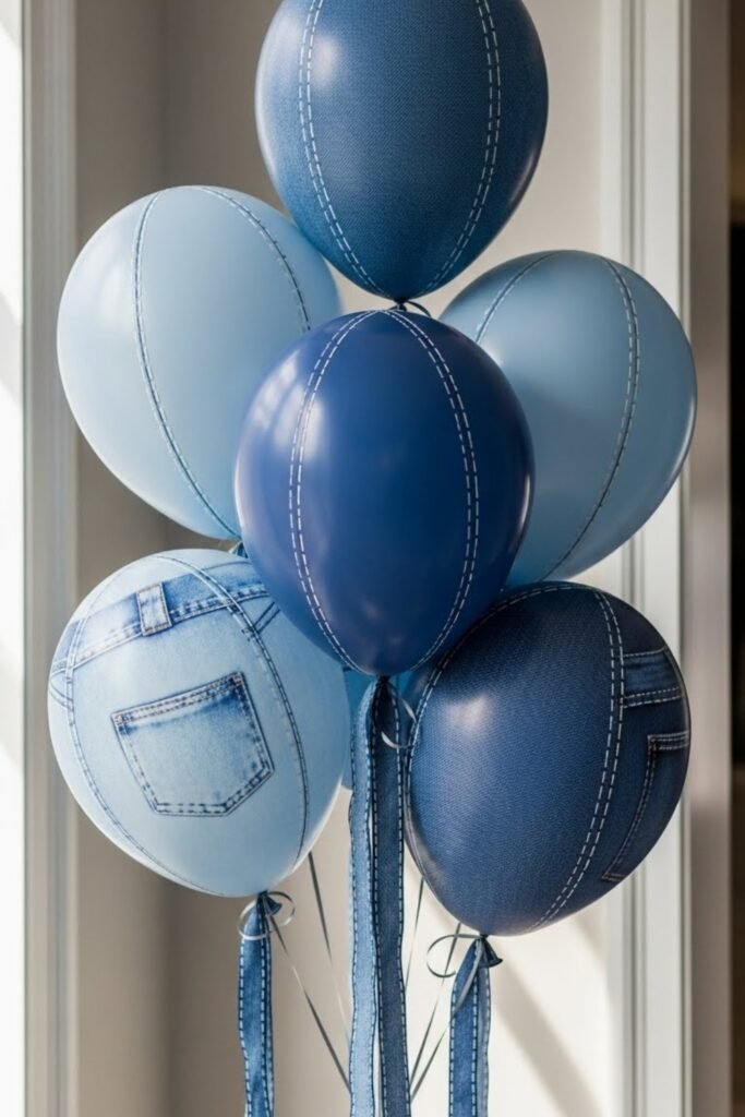 Use solid blue balloons in varied denim-inspired shades rather than printed designs. Group them tightly in clusters near key areas like the entrance or photo zone.