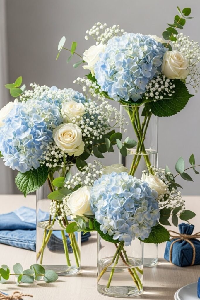 Use soft blue flowers mixed with white or cream stems to echo denim tones without using fabric everywhere. Arrange them loosely in clear or neutral containers so the color feels airy, not heavy.