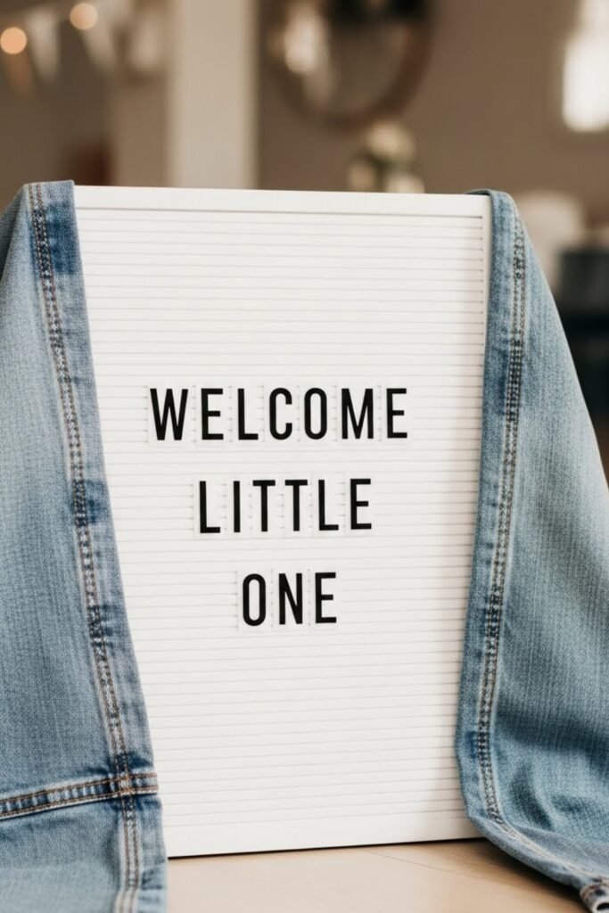 Add a simple neutral baby sign or soft lighting so the denim texture stands out without competing with extra decorations.