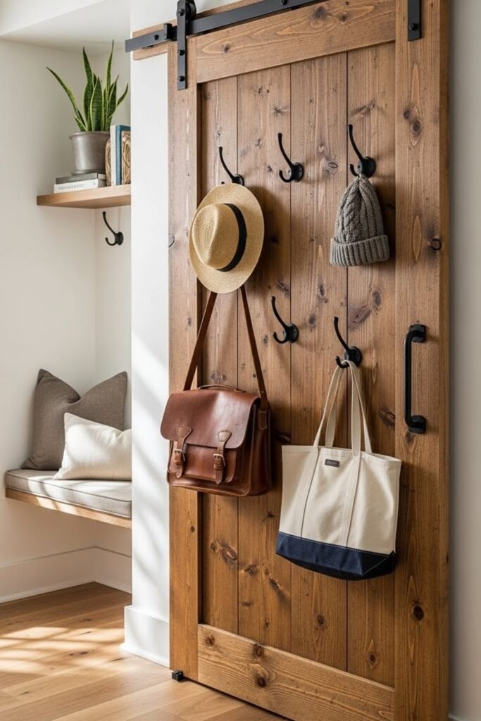 This barn door doubles as storage for small spaces. Install sturdy hooks or a slim rail on one side of the door for bags, hats, or towels.