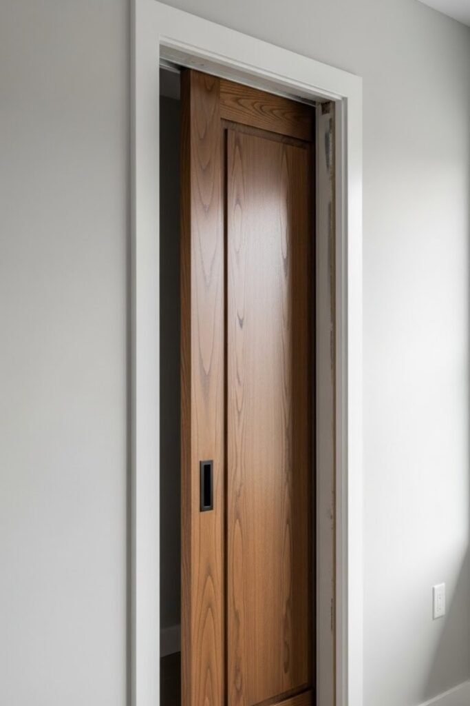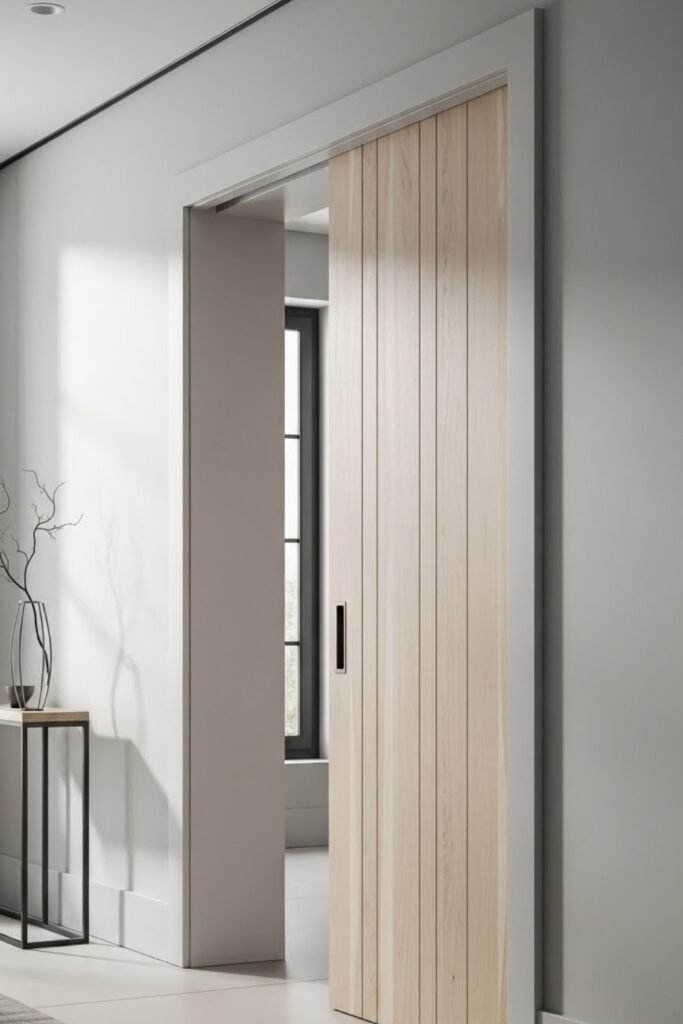 This works well in modern homes where clean lines matter. The door still slides smoothly, but the finished look feels more built-in and polished.