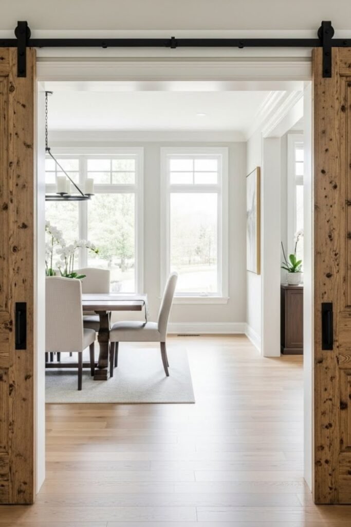 Double sliding barn doors work best for wide openings like dining rooms or large closets. Each door slides outward from the center, creating a balanced look.