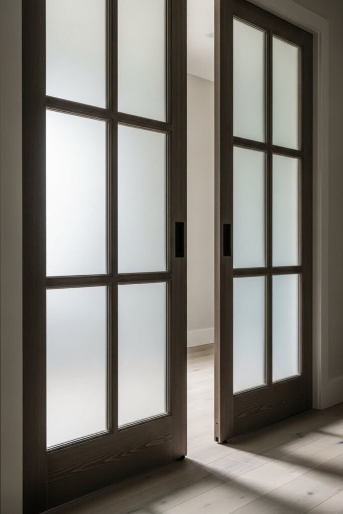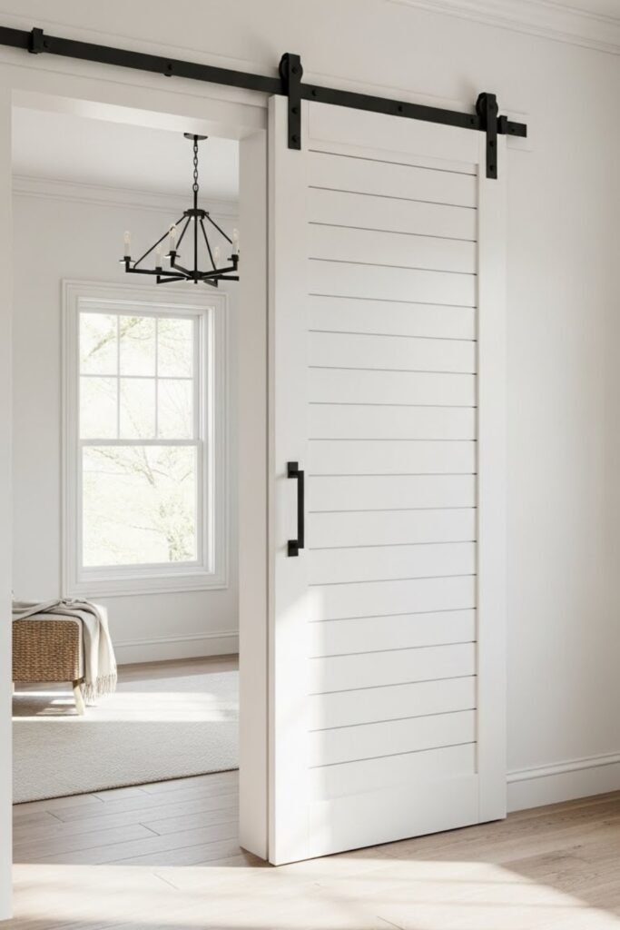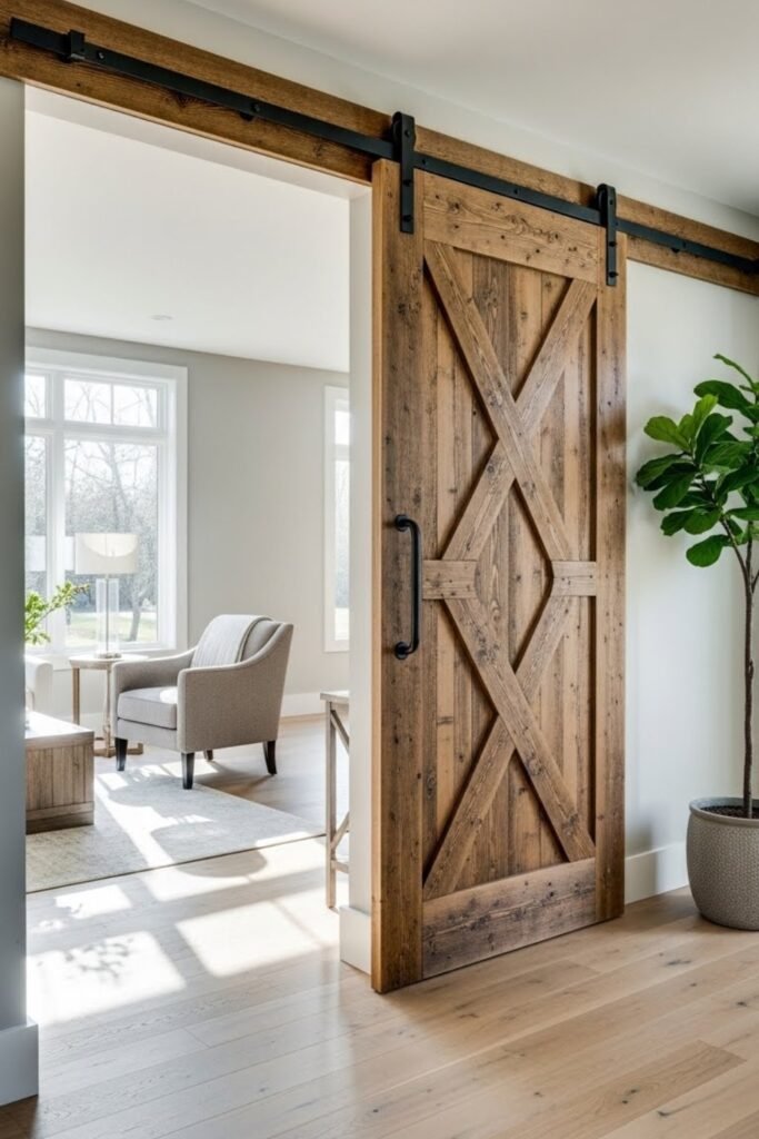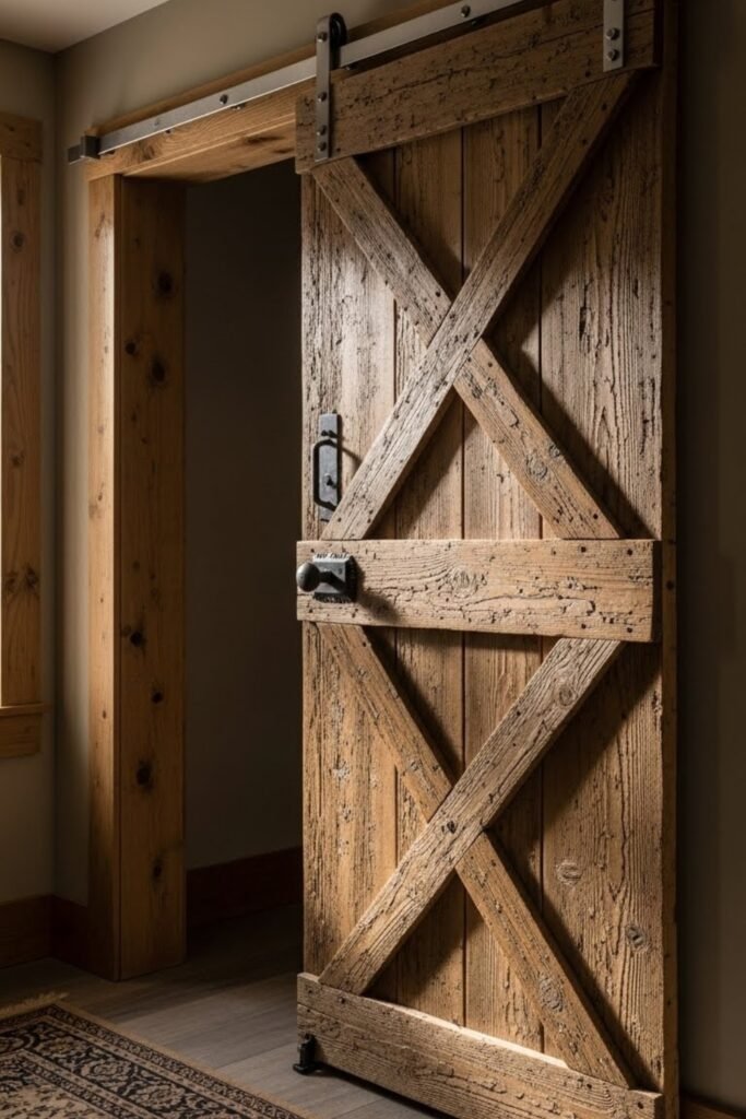 A glass pane barn door works well when you want separation without blocking light. Use tempered or frosted glass for safety and privacy.