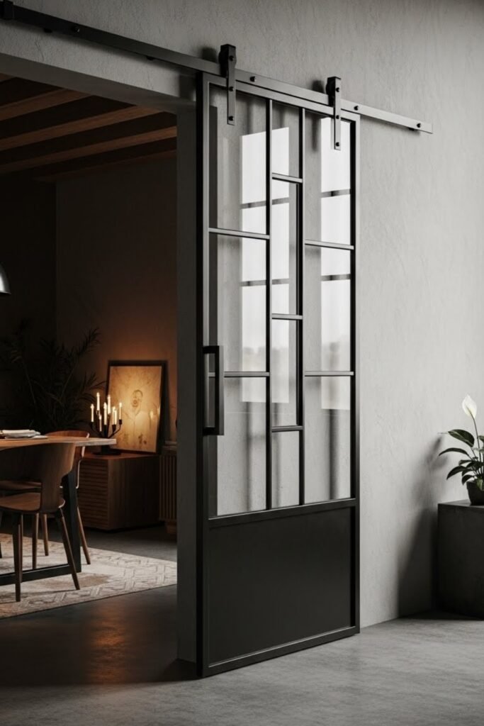 A metal frame barn door adds an industrial edge without feeling heavy. Use a steel or aluminum frame with wood or glass panels inside.