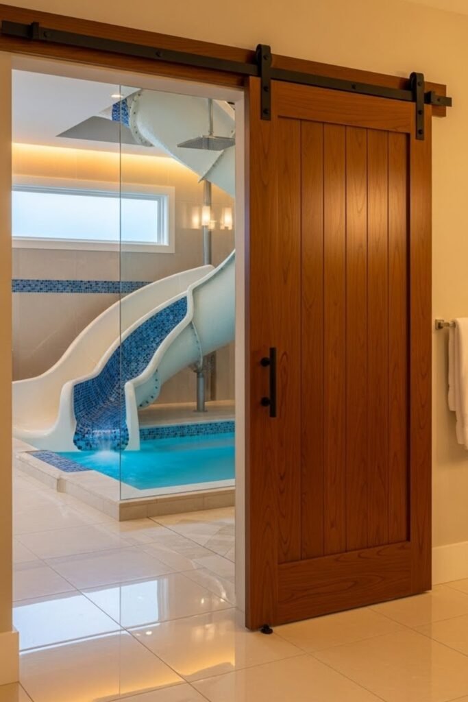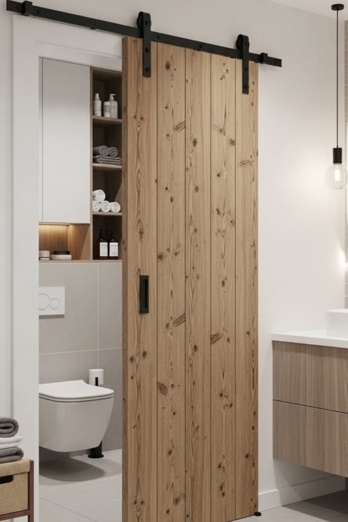A bathroom barn door needs extra planning for privacy and moisture. Use solid panels instead of gaps and add a bottom guide to prevent movement.