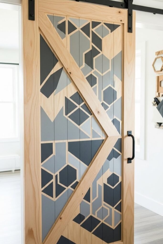 A stenciled barn door lets you add personality without complex woodworking. Start with a smooth base and apply paint using a large stencil pattern.