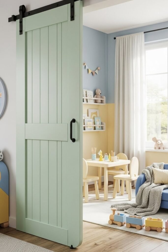 A kid-friendly barn door focuses on safety first. Round the edges, avoid sharp metal corners, and use soft-close tracks.