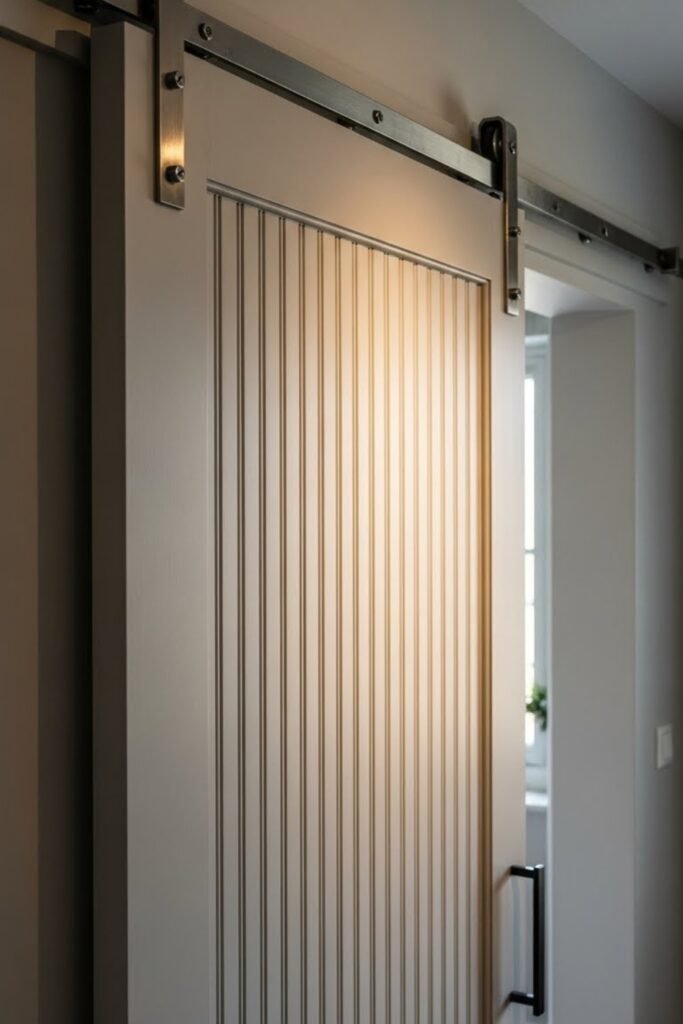 A textured panel barn door adds depth without complicated framing. Use beadboard, fluted panels, or grooved plywood for interest.