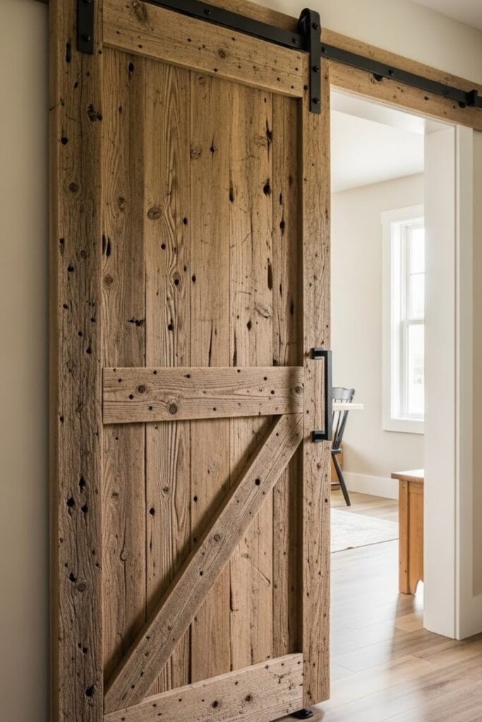 If you want a rustic barn door without forcing the look, reclaimed boards do the work naturally. Old fence planks or pallet wood already have texture and color variation.