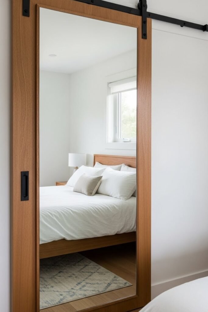 A mirror-front barn door adds function without adding clutter. Mount a full-length mirror onto a solid wood backing and reinforce the edges.