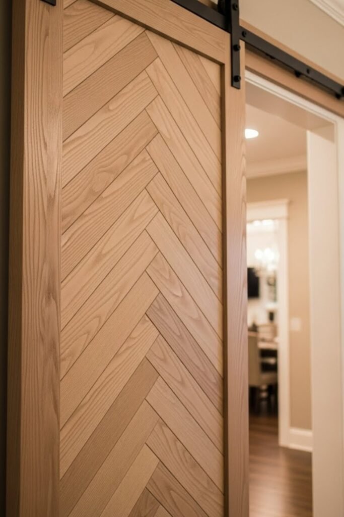 A herringbone barn door feels detailed and upscale without being flashy. Lay short wood planks in a staggered zigzag pattern, then secure them to a flat base.