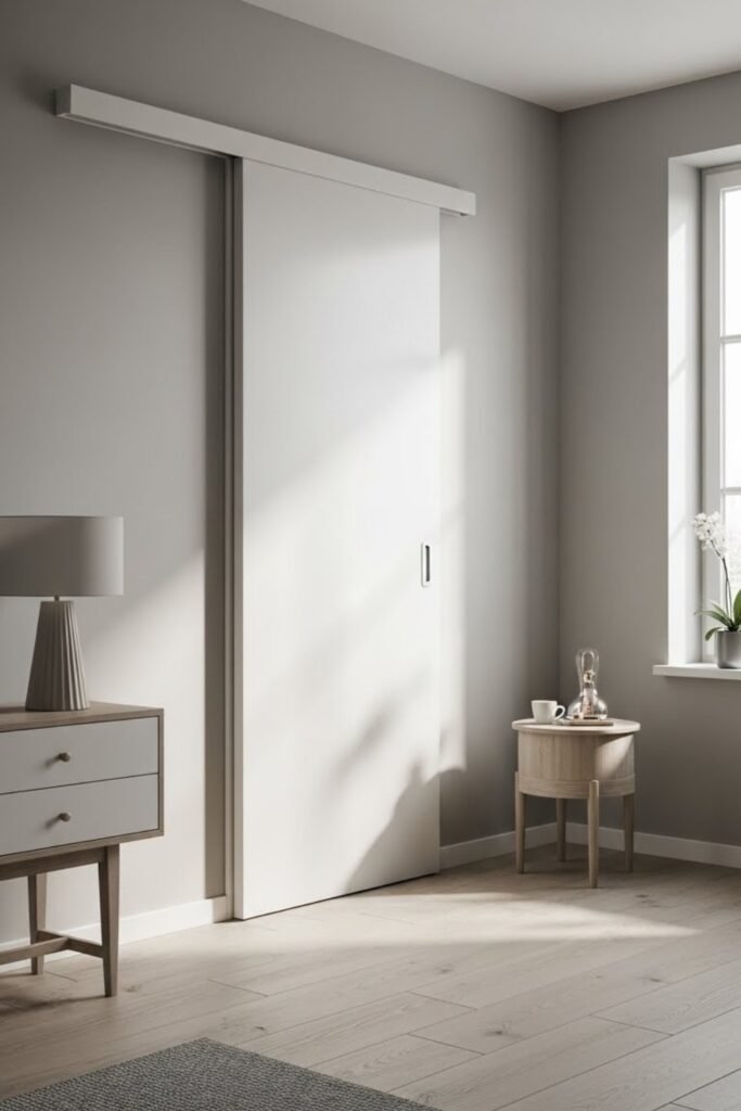 A hidden track barn door keeps the focus on the door itself. Use a recessed or covered track system so hardware stays out of sight.