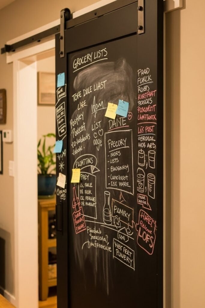 A chalkboard barn door adds function and personality at the same time. Use chalkboard paint on a smooth wood surface so writing stays clear.